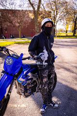 Unisex short-sleeved black zip-up, with regular fit, front "sosa brand" printed in white, a hooded smoking woman and on the back is printed logo "sosa brand" in white. the zip-up may follow different aspects upon manufacturing and handling. these are not considered to be flaws in the zip-up.