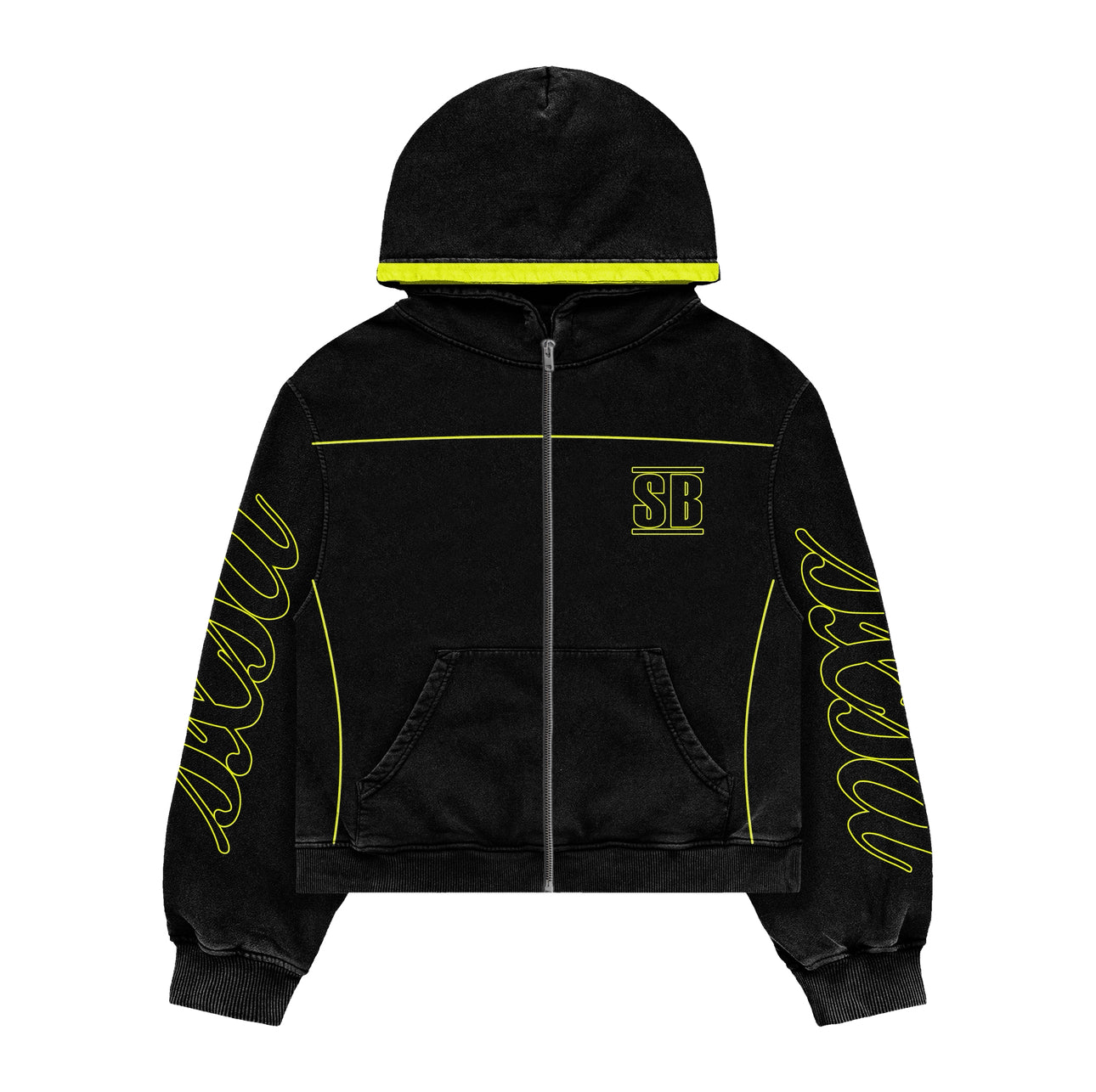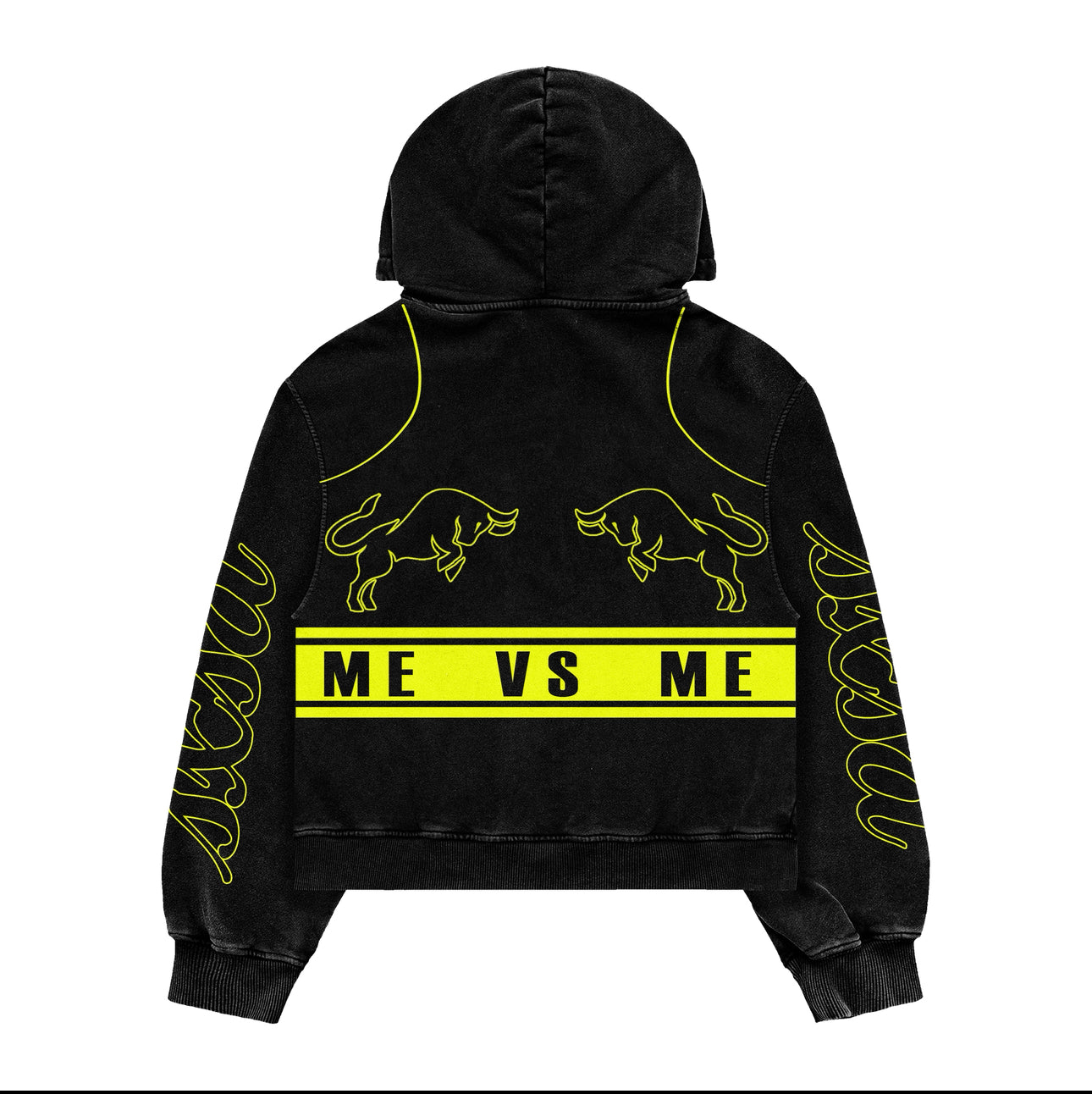 Black full-zip hoodie with a relaxed, standard fit. The back features two neon yellow bulls facing off with “ME VS ME” printed across the center in bold block letters. Both sleeves display “SXSA” printed vertically in neon yellow script. The front includes a small “SB” logo on the left chest, a horizontal yellow line across the upper chest, and matching yellow lines running vertically on both sides next to the front pockets. Additional yellow lines appear on the back, framing the bull graphic for added detail. The hood features a separate neon yellow design. Includes two front pockets and a black zipper down the center. Designed to match the ‘No Opp’ Tracksuit Pants as part of the ‘Mirror Match’ set.