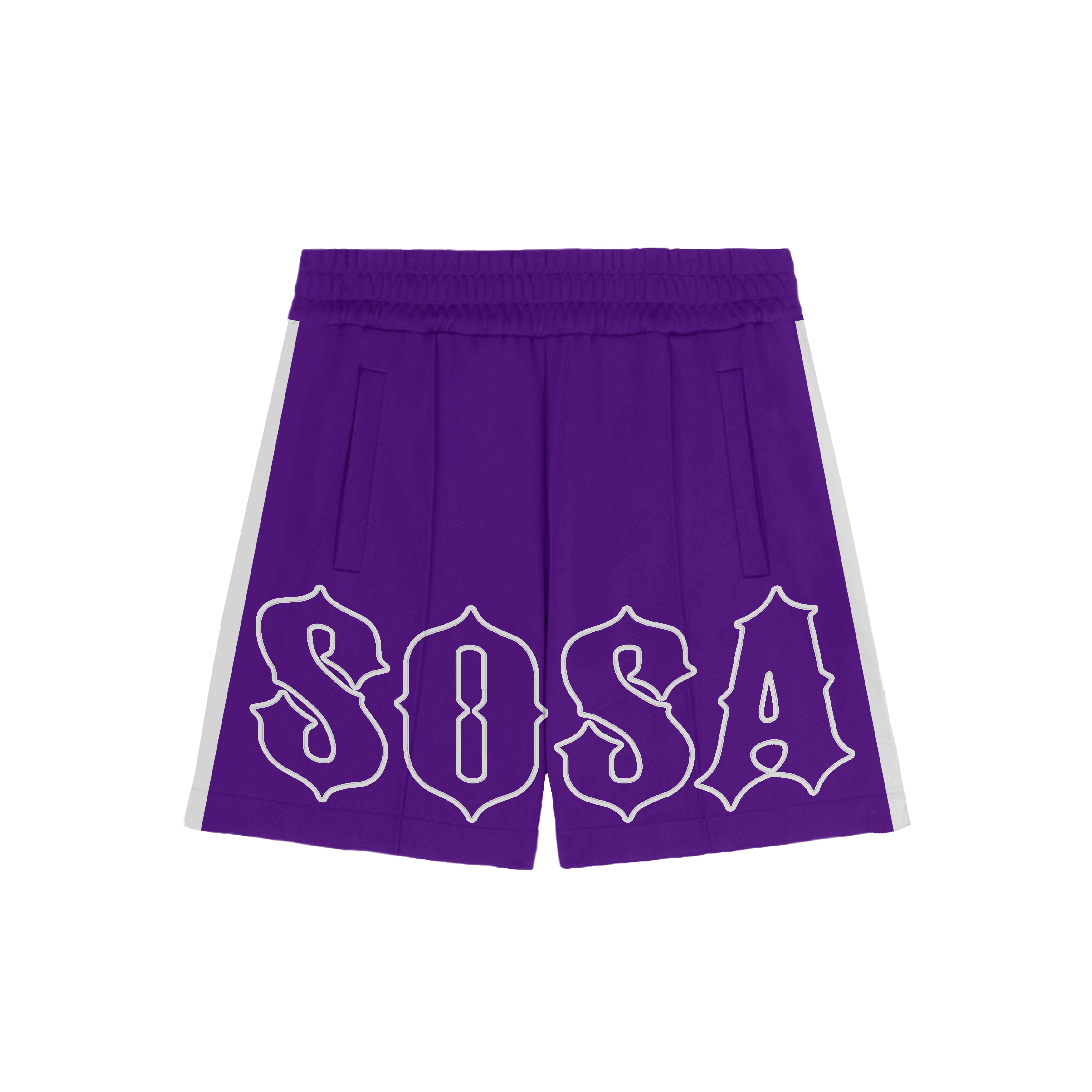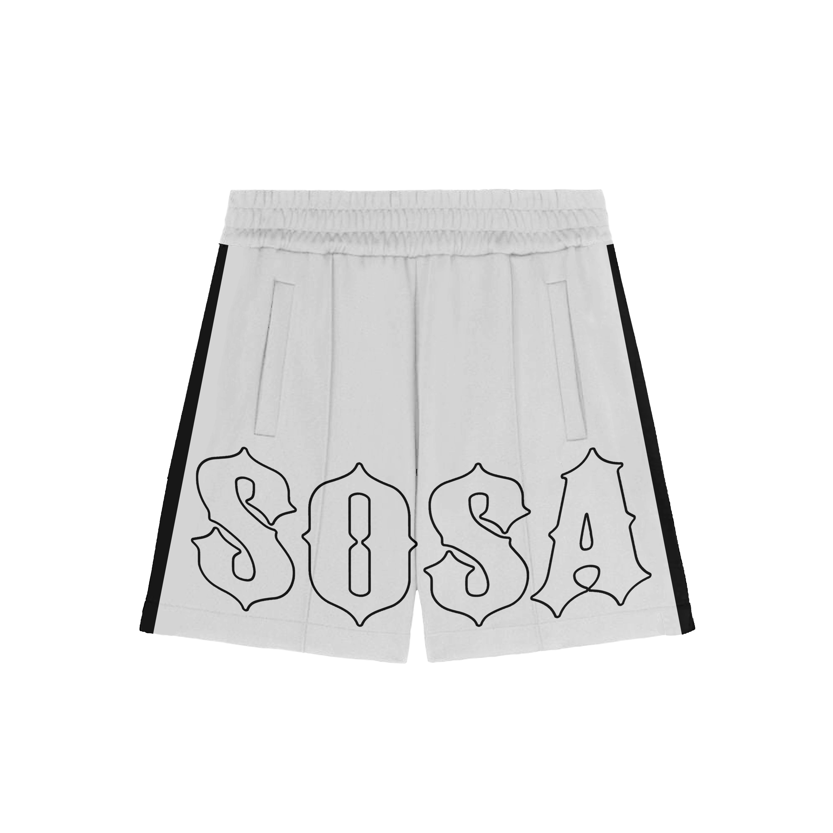 The Sosa Brand Hellprint Shorts feature oversized “SOSA” lettering printed across the front. They have an elastic waistband, side pockets, and contrast stripes along the sides. The shorts are black with a relaxed fit and lightweight feel, designed for everyday comfort and movement.