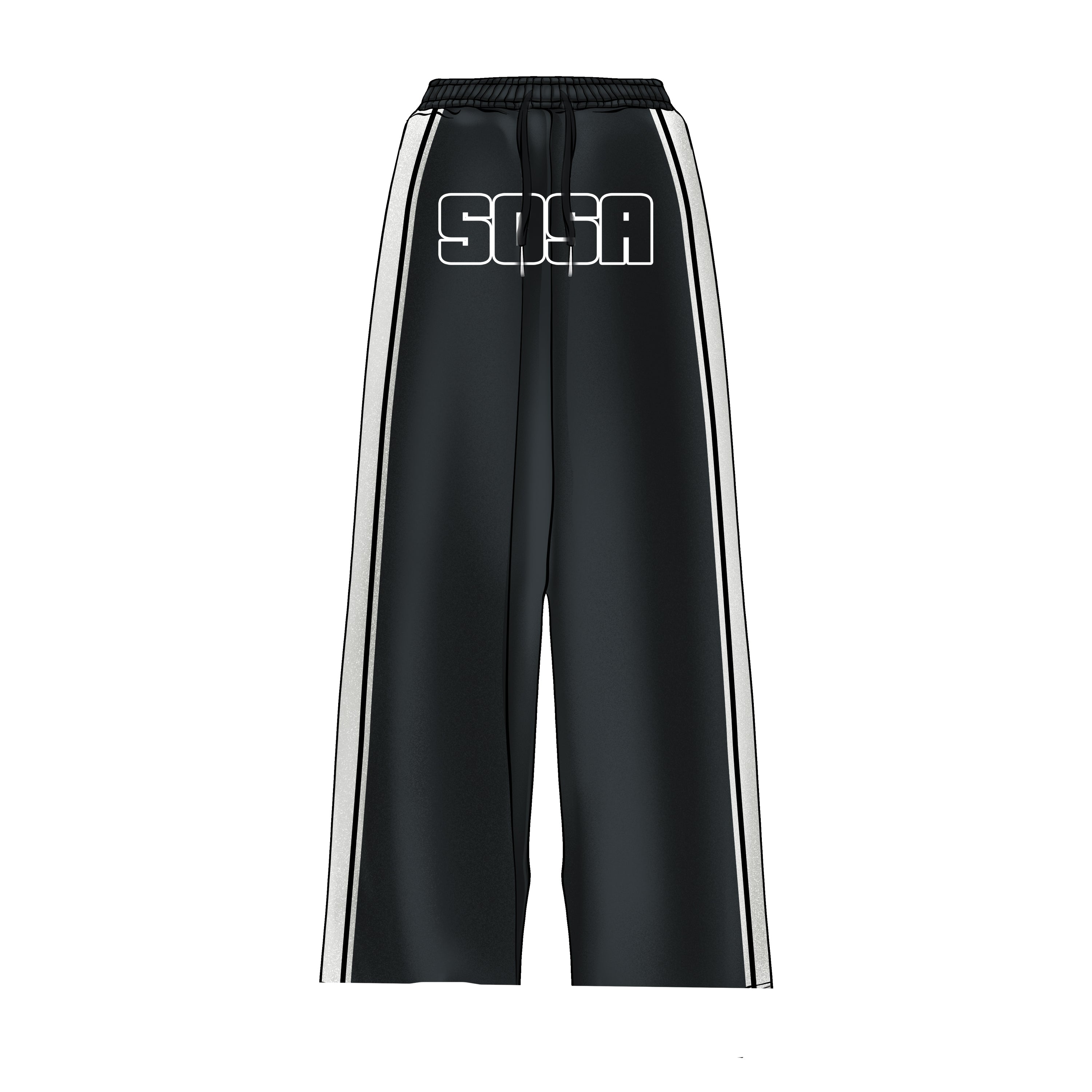 Black wide-leg track pants with a white SOSA logo across the front waist. Designed with double white side stripes running down each leg. Includes an elastic waistband with adjustable drawstring for a secure fit. Made from a smooth, lightweight material with a relaxed cut for everyday wear, movement, or layering. Finished with clean hems and subtle stitching throughout.